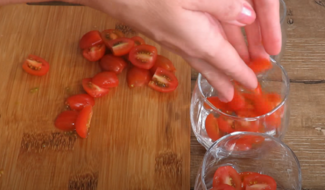 - В стаканы раскладываем половинки черри, поливаем заправкой с оливковым маслом.