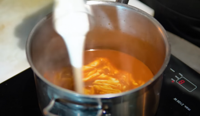 - В процеженную основу соуса выливаем сливки, кипятим до легкого загустения.