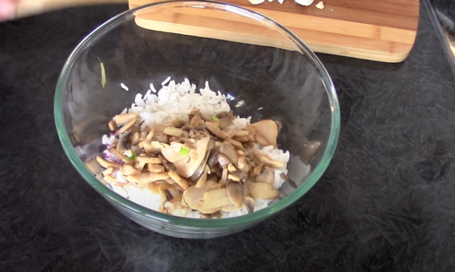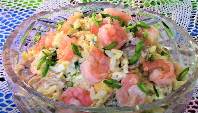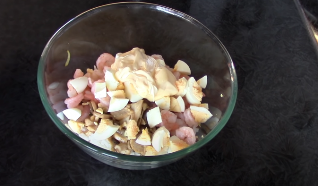 - Туда же отправляем и ранее подготовленные ингредиенты: рис, грибы, креветки. Сдабриваем все майонезом, перемешиваем и оформляем подачу салата к новогоднему столу.