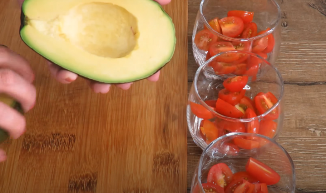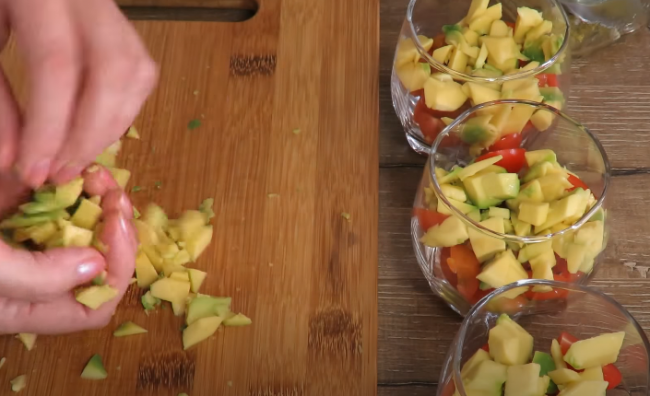 - Раскладываем авокадо поверх помидоров, сразу поливаем оставшейся первой заправкой, чтобы кусочки фрукта не потемнели.