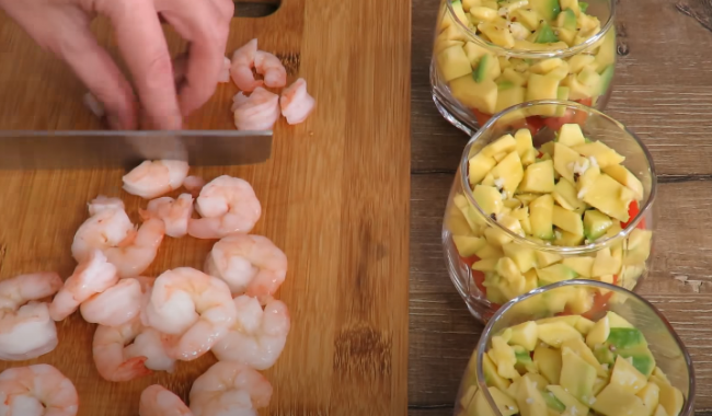 - Предварительно отваренные в подсоленной воде креветки нарезаем средними кусочками, выкладываем к ним вторую заправку с майонезом, перемешиваем и раскладываем в стаканы завершающим слоем.