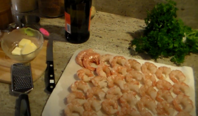 - После разморозки креветки очищаем от панциря и кишки, укладываем на рабочую поверхность, обсушиваем бумажным полотенцем, солим, перчим.