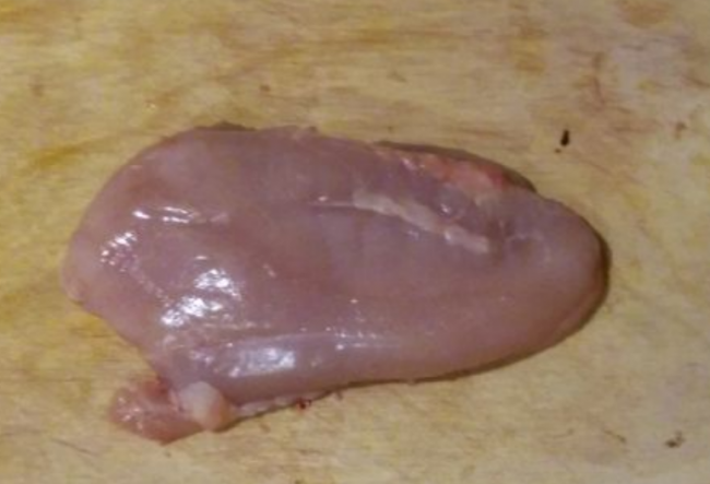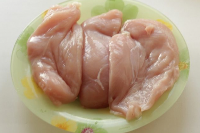 - Помыть мясо, убрать пленки, жирок, нам нужно только чистое мясо. Каждую половинку грудки разрезать вдоль на две примерно равные по толщине части. Получается из одной целой грудки 4 длинных не толстых куска. Обсушить бумажным полотенцем каждый кусок.