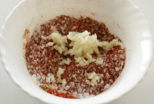 - В одной миске подходящего размера смешать черный и красный молотый перцы с паприкой. Выдавить половину от указанного количества чеснока в полученную заготовку.