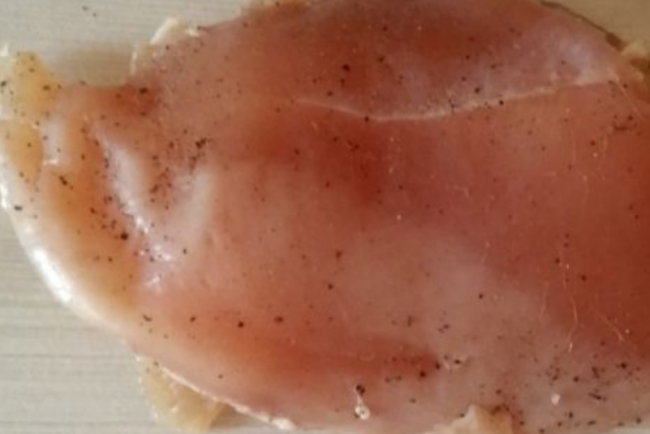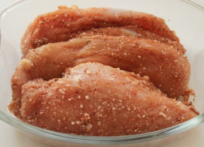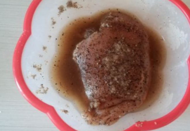 - В эту смесь положила куриное филе, натерла курицу специями. Хорошо, со всех сторон обмазала мясо специями и поставила миску в холодильник на двенадцать часов. Через двенадцать часов вынула курицу из холодильника. Соль вытянула очень много жидкости. Мясо стало более упругим и плотным.