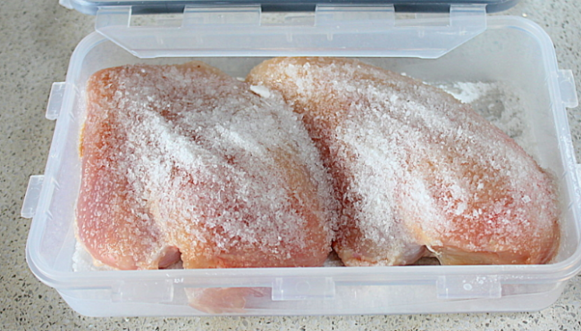 - На дно пищевого контейнера насыпать полторы ложки соли. Сверху выложить куриные грудки и присыпать оставшейся солью.