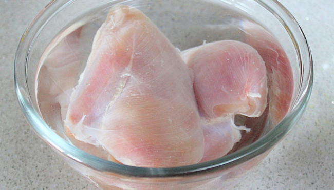 - Контейнер прикрыть и поставить на сутки в холодильник. Через 24 часа грудку достать, промыть от соли и положить в миску с холодной водой на 5 часов.