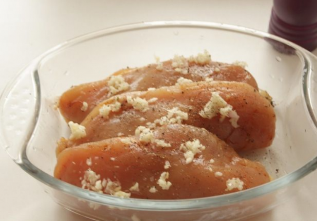- По истечении указанного времени промыть грудки. Нужно постараться удалить специи. Затем высушить мясо бумажным полотенцем. Измельчить оставшийся чеснок и натереть им грудки, добавив немного черного молотого перца.