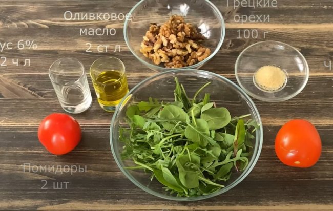 - В салатник отправляем зелень, сверху раскладываем кусочки томатов и ореховую заправку.