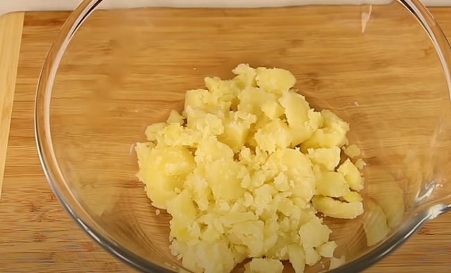 - Картофель чистим, отвариваем до готовности с добавлением соли, а затем толчем в пюре.