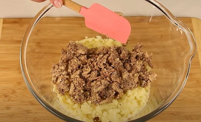 - Теперь к толченому картофелю добавляем рыбу, рис и лук, тщательно все вымешиваем.