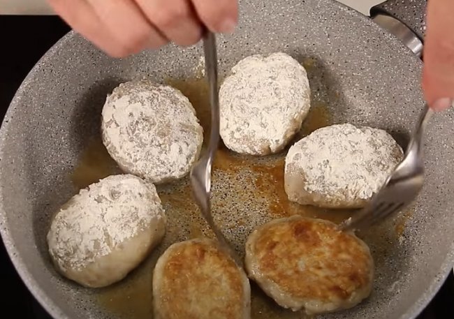 - Из фарша лепим котлеты, панируем в муке и жарим на масле с двух сторон до золотистости.