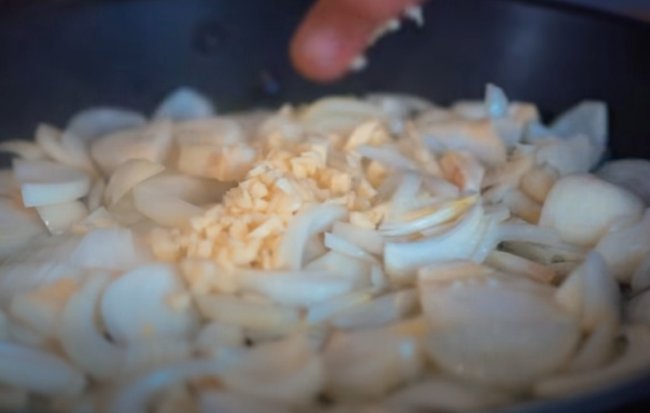 - На плиту ставим еще одну сковороду, также разогреваем в ней масло и слегка пассеруем нарезанный полукольцами лук. После добавляем к нему мелко покрошенный чеснок.