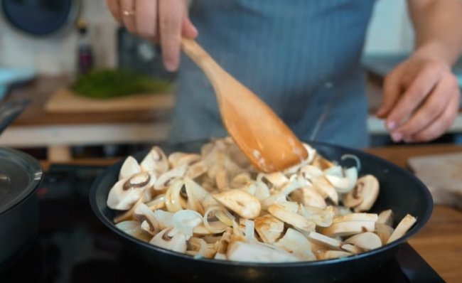 - Пластинами режем шампиньоны и обжариваем вместе с луком и чесноком.