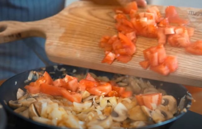- Как только грибы пустят сок, добавляем томаты, их нарезаем более мелкими кусочками. Также не забываем про острый перец, его нужно предварительно измельчить.