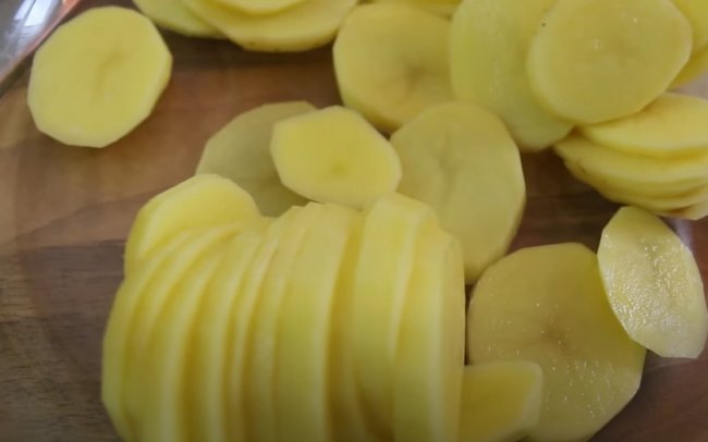 - Тонкими кружочками нарезаем очищенные клубни картофеля.