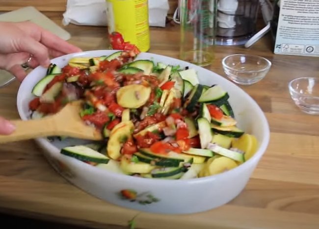 - Картофель с кабачками отправляем в форму, следом нашинкованный мелкими кубиками лук, порезанные небольшими кусочками томаты и измельченную зелень петрушки.