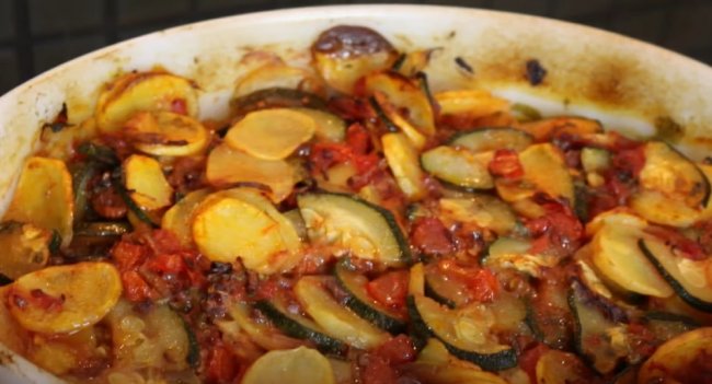 - Овощи хорошо перемешиваем, подливаем немного воды и ставим в духовку на 90 минут (температура 200°С).