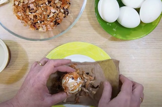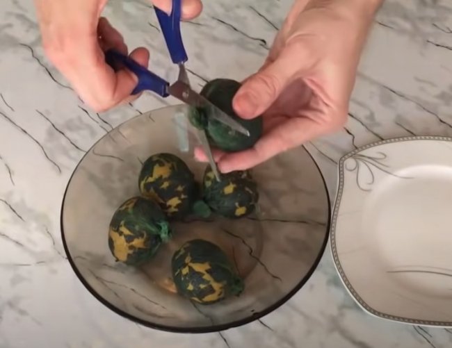 - Снимаем с яиц марлю, остатки шелухи смываем водой, просушиваем.