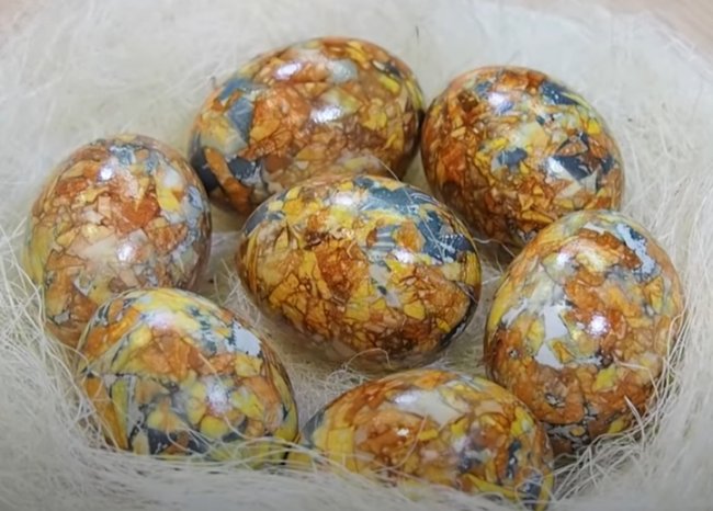 - После снимаем капрон, убираем всю шелуху, обсушиваем яйца бумажными полотенцами и придаем им блеск с помощью обычного растительного масла.