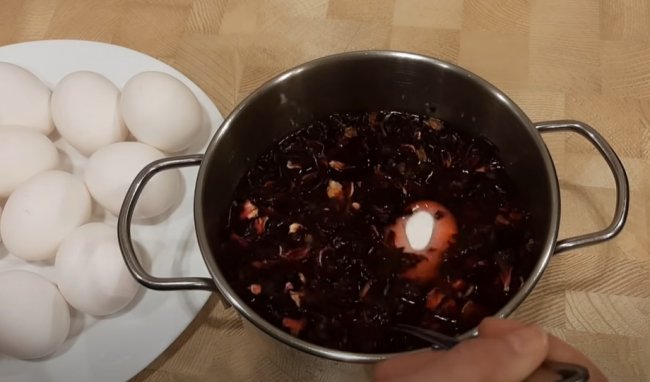 - Ставим на плиту, с момента закипания выдерживаем на огне 15 минут, а затем их можно оставить в отваре для более насыщенного цвета или сразу переложить в емкость с холодной водой.