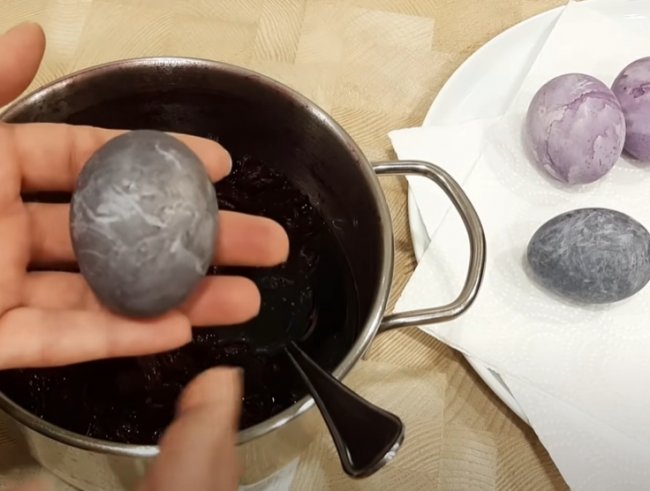 - После салфетки разрезаем, очищаем яйца от шелухи, просушиваем и натираем маслом для блеска.