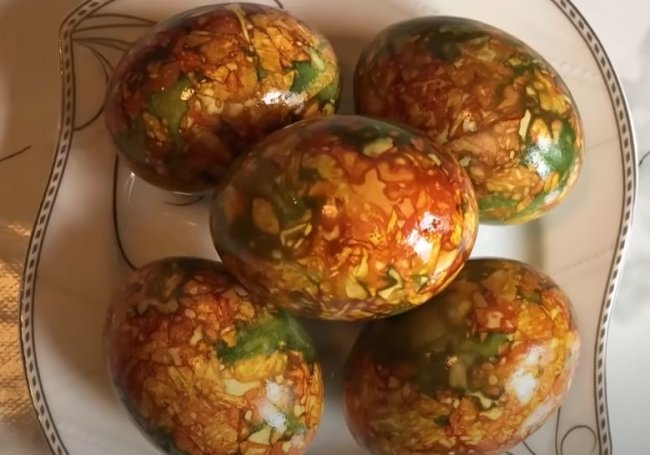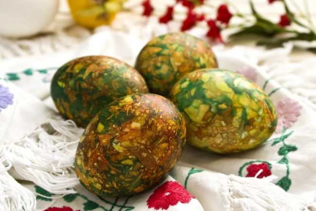 Покрасить яйца на Пасху 2022 можно с помощью как пищевых, так и натуральных красителей. Оригинальные «мраморные» яйца получаются в луковой шелухе и зеленке. Способ интересный, необычный, проверенный, поэтому стоит рассмотреть его более подробно.