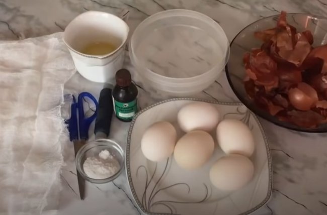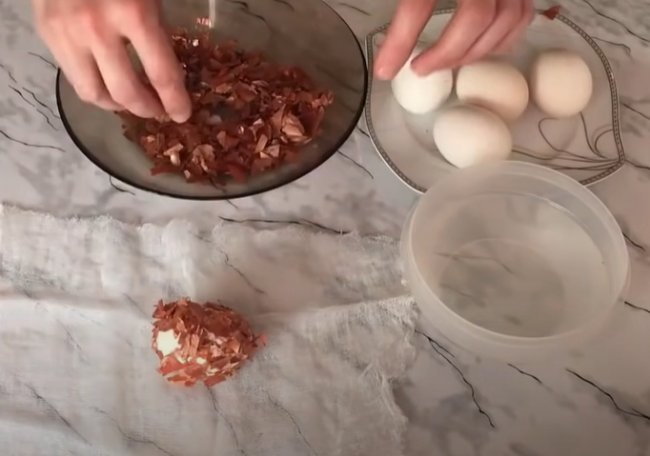 - Хорошо промываем и обезжириваем уксусом яйца. Промытую и просушенную луковую шелуху измельчаем на мелкие кусочки. Также подготовим несколько кусочков капрона, нитки и мисочку с водой.