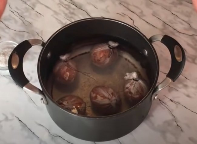 - Погружая яйца в луковый отвар, следите, чтобы они не стукались друг от друга, это также предотвратит появление трещинок на скорлупе.