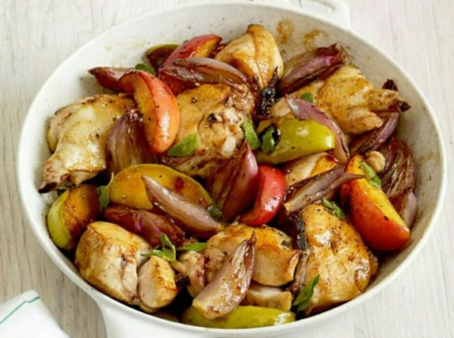 - Ужин: макароны и куриная грудка с яблоками, приготовленная в духовке.