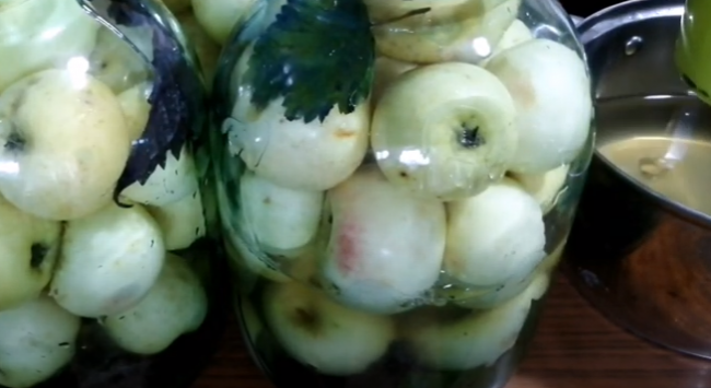 - Выбираем хорошие яблоки, светлые или с красным бочком. Хорошо промываем и укладываем в чистые банки вместе с листиками черной смородины. Также можно использовать листики дуба или вишни.