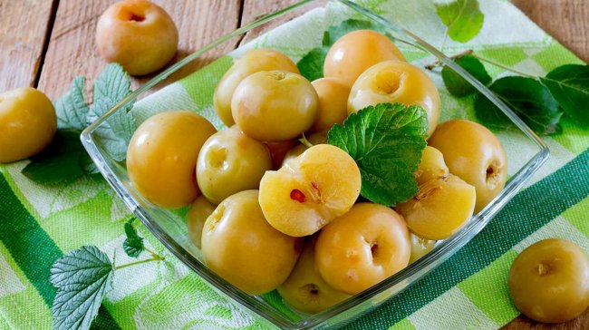 - Затем закрываем фрукты оставшейся зеленью и заливаем все подготовленным рассолом.