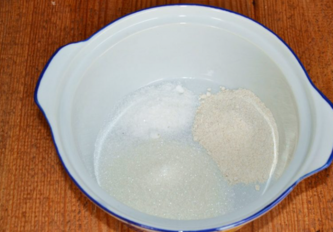 - В большой емкости соединяем соль с сахаром и ржаной мукой.