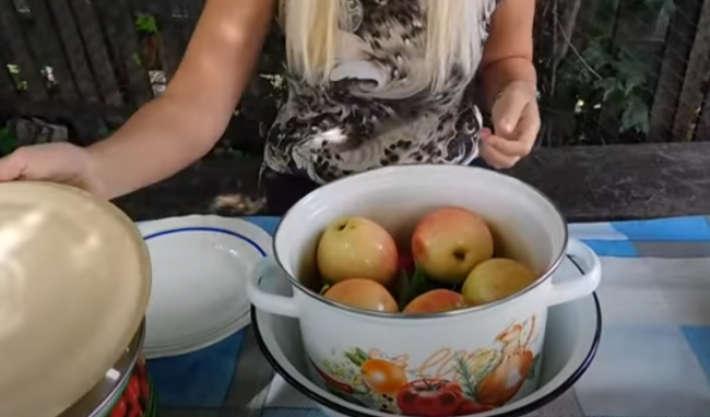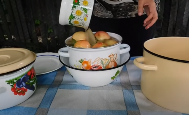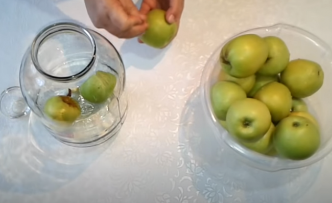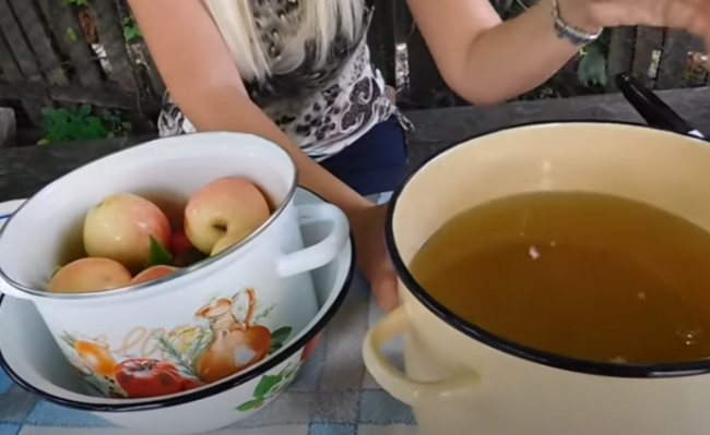 - Первую воду с яблок сливаем, второй раз заливаем кипятком, снова оставляем фрукты на 20 минут. Эту воду затем также нужно будет слить.