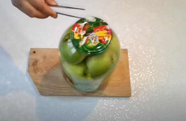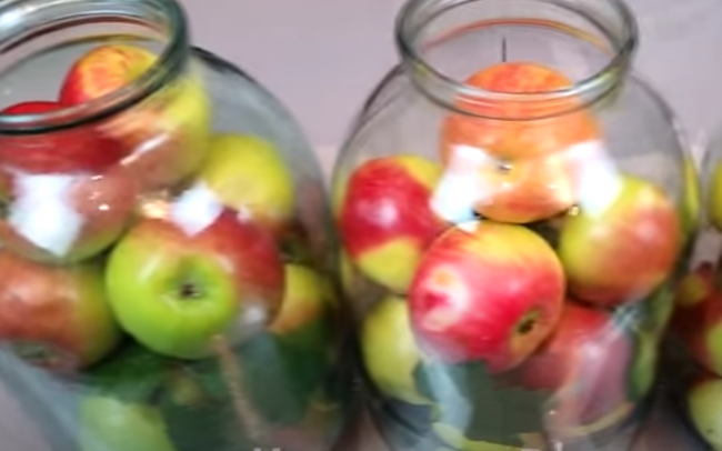 - Яблоки промываем и зубочисткой в нескольких местах делаем проколы. Банку заполняем фруктами, заливаем их кипятком и под стерильной крышкой оставляем на 20 минут.