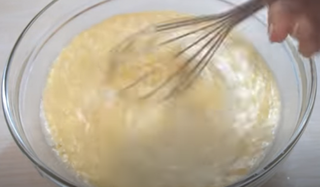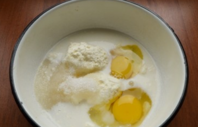 - В хорошо взбитые яйца отправляем мягкое масло, сметану и творог. Объединяем ингредиенты, перемешиваем в течение нескольких секунд.