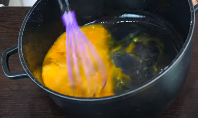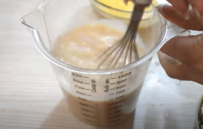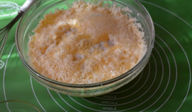 - В отдельной чаше обычным венчиком взбалтываем яйца, переливаем в дрожжевую смесь и следом кладем кусочки мягкого масла.