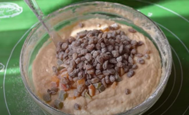 - В процессе замешивания тонкой струйкой вливаем сливки любой жирности. Добавляем цукаты и предварительно хорошо промытый и высушенный изюм. Вмешиваем в тесто.