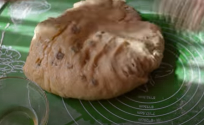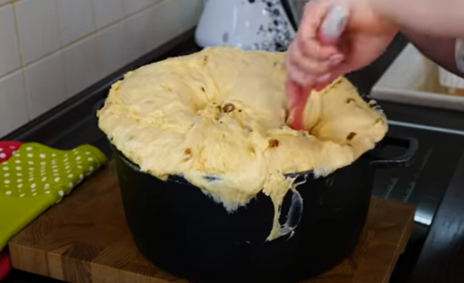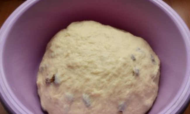 - С последней порцией муки добавляем изюм. Все вымешиваем прямо в миске, накрываем и оставляем тесто в тепле примерно на час.