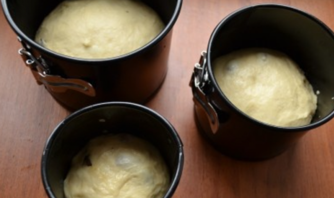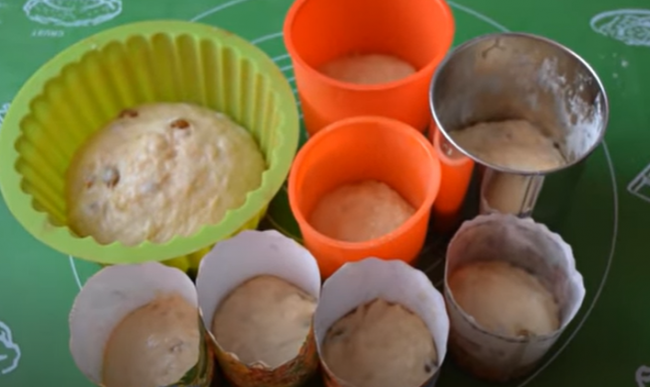 - После третьего подъема из теста выпускаем лишний воздух, просто обминаем. Руки смазываем маслом и раскладываем тесто по формочкам.