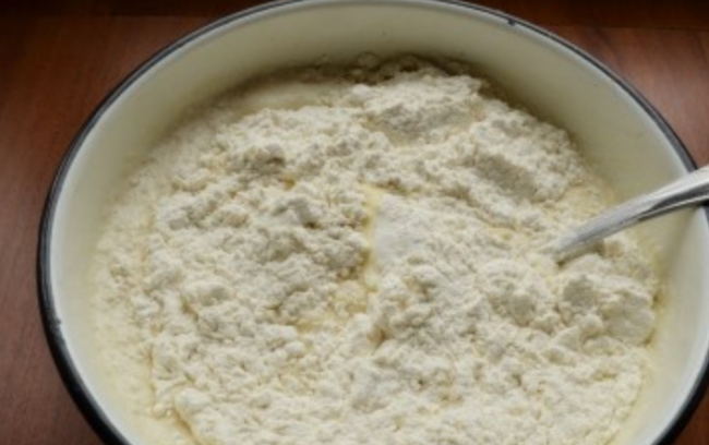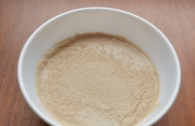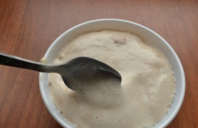 - Начинаем с опары. Немного подогреваем молоко, всыпаем в напиток дрожжи, ложку сахара и примерно 100 г муки. Все ингредиенты берем от общего количества. Тщательно размешиваем и оставляем опару в тепле до ее увеличения в объеме в 2-3 раза.