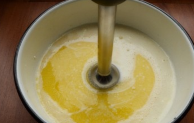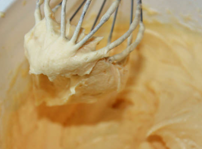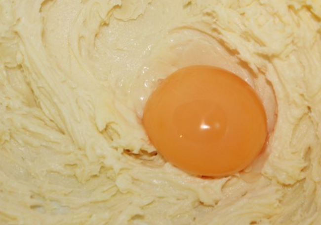 - Не прекращая работу миксера, малыми порциями подсыпаем к маслу сахарную пудру. На следующем этапе по одному вводим желтки.