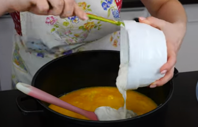 - К яйцам выливаем теплое молоко, следом растопленное не горячее масло, сметану. А также всыпаем обычный и ванильный сахар, соль, размешиваем.