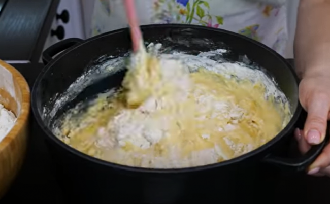 - Теперь массу соединяем с опарой, тщательно все размешиваем и начинаем подсеивать муку. Выкладываем тесто на стол, поливаем маслом и месим в течение 15 минут.