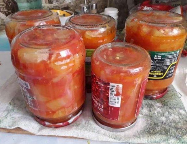 Заготовку храним в темном прохладном месте. Для более длительного хранения банки с овощной закуской можно простерилизовать в течение 15 минут.