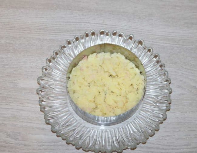 - Все готово, самое время приступить к сборке салата. Первым слоем выкладываем картофель.