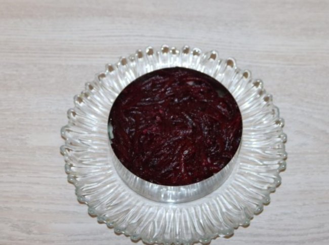 - Далее распределяем равномерно свеклу, как и картофель, натертый на терке.