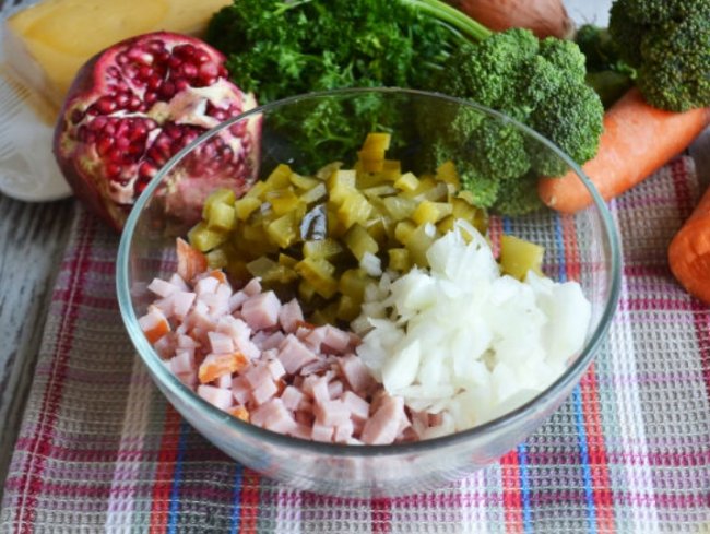 - Мелкими кубиками нарезаем огурцы, луковицу и ветчину, соединяем все это в единой емкости. Добавляем соль, перец, майонез, все перемешиваем.