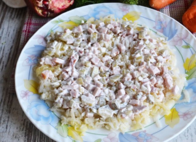 - Аккуратно распределяем часть уже заправленной салатной массы с ветчиной.