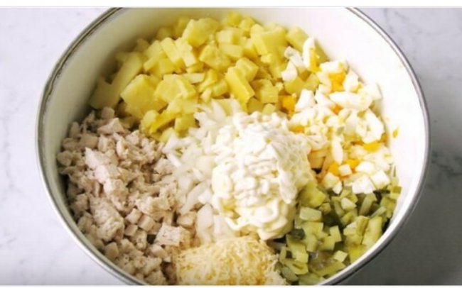 - Отдельно отвариваем яйца, картофель в мундирах и куриное мясо. Все остужаем, очищаем, как можно мельче нарезаем.